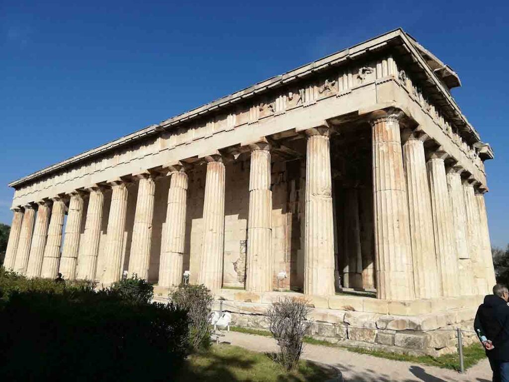 In zona exista doua constructii importante care merita toata atentia: Templul lui Hefaistos si Porticul lui Attalos. Templul este usor de identificat, inaltandu-se deasupra arborilor aflati in acei colt al Agorei, si seamana cu un Parthenon in miniatura. Mai este cunoscut si sub numele de Thissio, nume purtat si de imprejurimile Atenei, dar si de statia de metrou din apropiere. Templul a fost construit intre anii 449-4-14 I.Hr., precedand astfel Parthenonul. De fapt, acesta a marcat inceputul epocii de dezvoltare a orasului, care a devenit cunoscuta drept Epoca de aur. Hefaistos era zeul-patron al mai multor lucruri, ca de pilda focul, artele, mestesugurile, fieraria, iar templul a fost construit in cartierul fierarilor din oras. Din punctul de vedere al gradului de conservare, acesta rivalizeaza chiar si cu Parthenonul, fiind unul dintre cel mai bine pastrate temple grecesti.