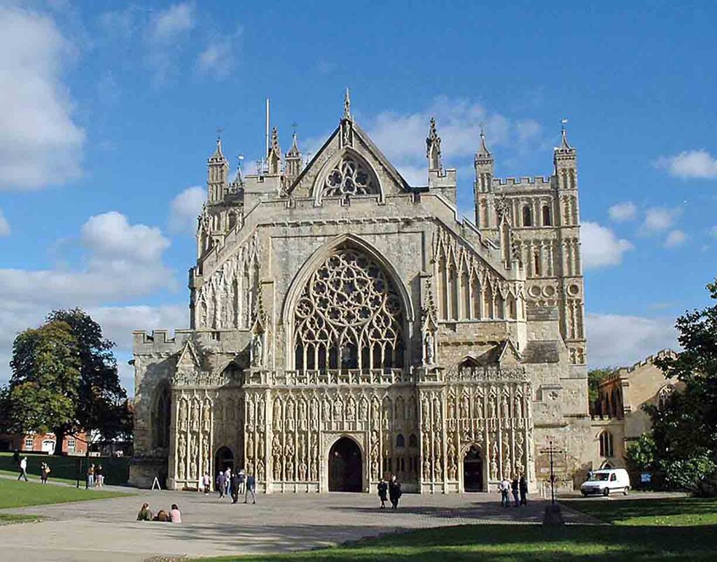 Catedrala Exeter, una dintre cele mai mari biserici din Marea Britanie, domina centrul orasului, impresia de marime fiind amplificata si de lipsa unui turn principal.