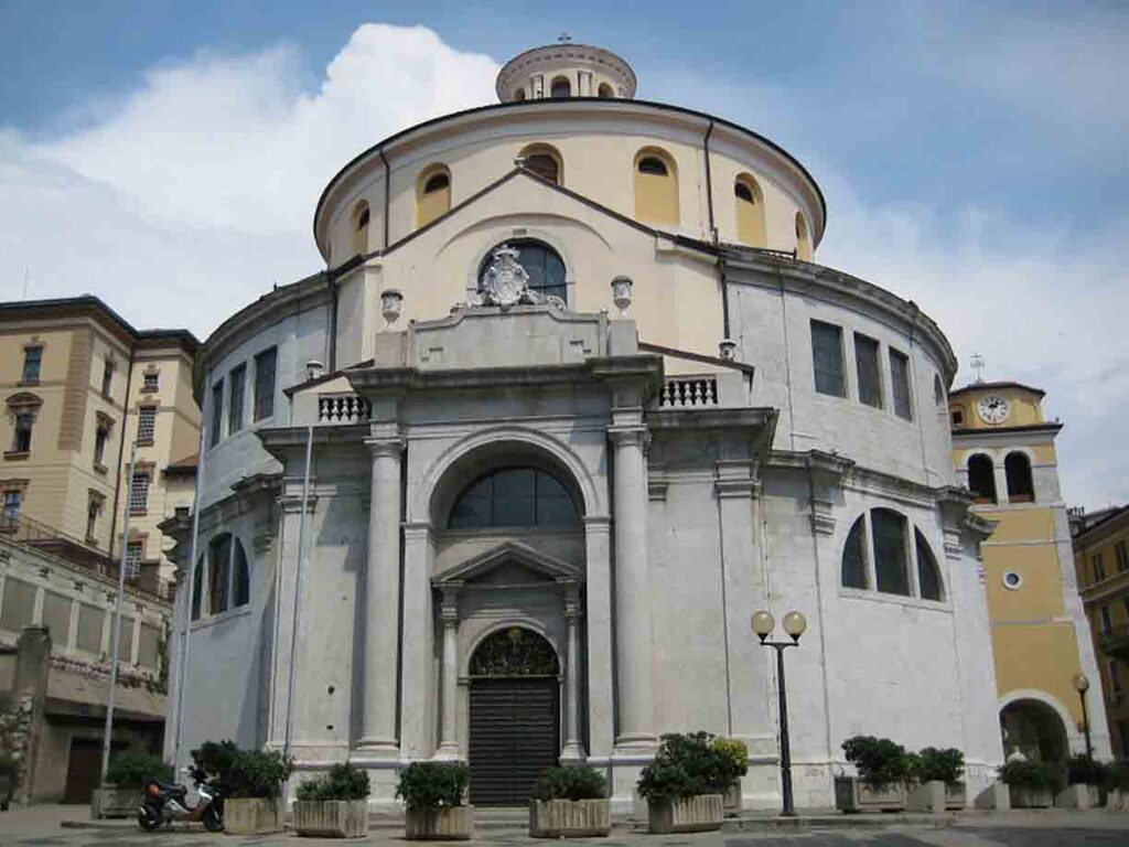 Ridicata in secolul XIII pe situl capelei sfantului si reconstruita intre secolele XVII si XVIII, biserica se prezinta cu o forma centrala, octagonala in interior. De observat ca altarele baroce si Crucifixul gotic renan din secolul XIII ce se afla pe altarul major.