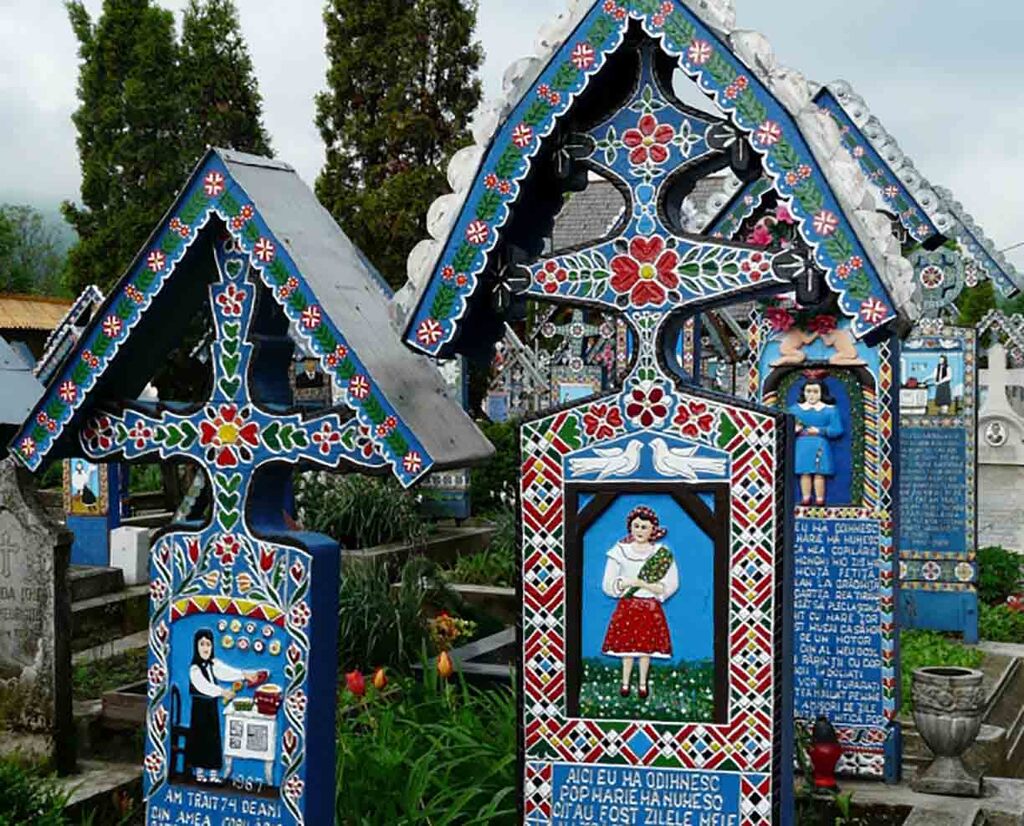 Unele cruci sunt pictate pe ambele parti. Pe o parte este plasata o descriere a vietii celui ingropat, iar pe celalalt o descriere a motivului mortii. Crucile mormintelor sunt viu colorate, picturile naive reprezentand scene din viata si ocupatia persoanelor inhumate. Pe unele cruci exista chiar versuri in care sunt amintite, deseori cu nuante umoristice, persoanele respective. Acest cimitir este practic un muzeu in aer liber, avand aproximativ 800 de astfel de cruci sculptate din lemn de stejar.
